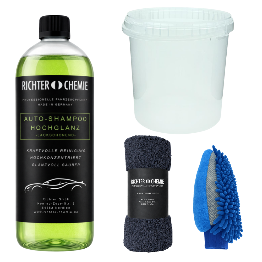 Das Auto Wasch-Set Komplett von Richter Chemie bietet alles, was Sie für eine gründliche und professionelle Fahrzeugreinigung benötigen. Das umfangreiche Autopflege Set mit Reinigern und Zubehör vereint leistungsstarke Reinigungsmittel mit hochwertigem Waschzubehör und ist ideal für die schonende Handwäsche Ihres Autos.