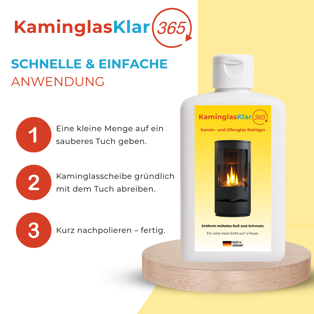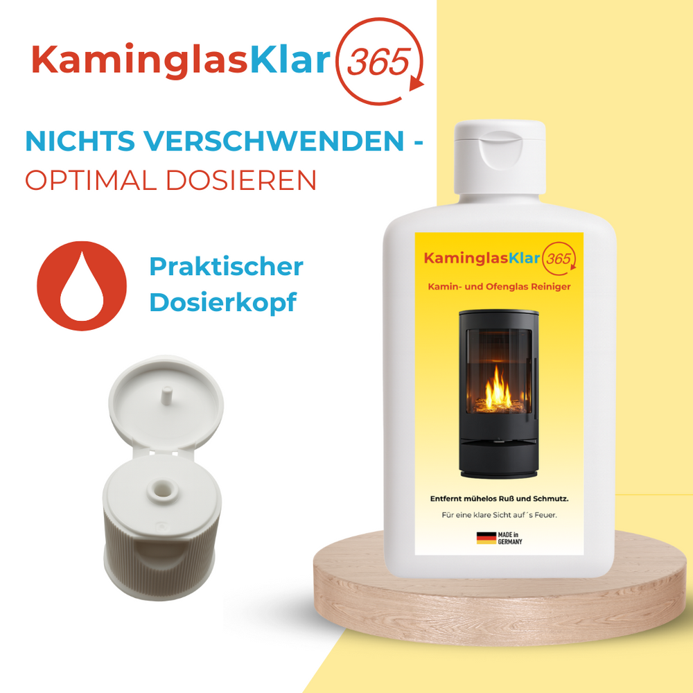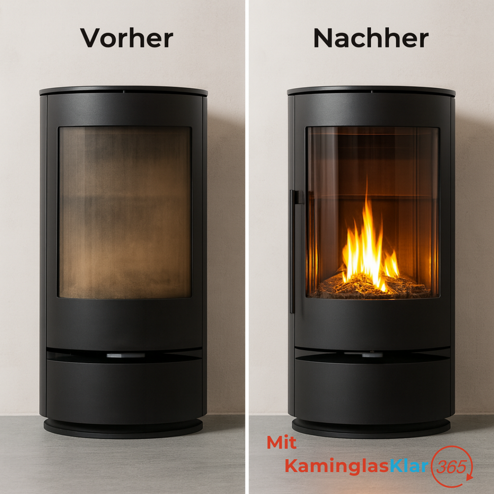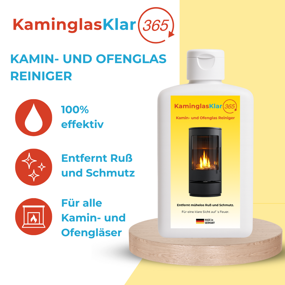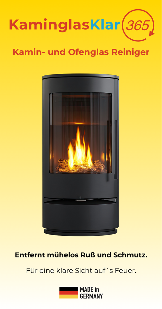 Kaminofen-Besitzer wissen: Nichts trübt die Stimmung mehr als eine verrußte Scheibe. KaminglasKlar365 Kaminglasreiniger ist der speziell entwickelte Kamin- und Ofenglas-Reiniger, der Ruß, Rauch- und Schmutzbeläge schnell löst und streifenfreie Sicht aufs Feuer zurückbringt. Ideal für Kaminöfen, Kamineinsätze und Ofentüren – einfach anwenden, effizient reinigen, länger genießen.