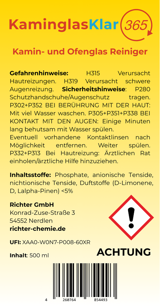 KaminglasKlar365 Kaminglasreiniger – 500 ml Kamin- & Ofenglas Reiniger von Richter Chemie