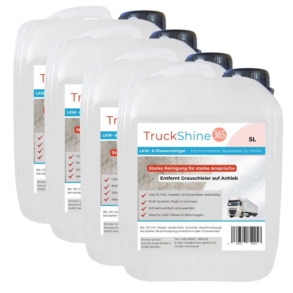 Saubere Planen und Fahrzeuge sind Ihr Aushängeschild. Der TruckShine365 LKW- & Planenreiniger wurde für Speditionen, Fuhrparks und anspruchsvolle Anwender entwickelt, die Grauschleier und hartnäckige Verschmutzungen schnell und zuverlässig entfernen möchten.